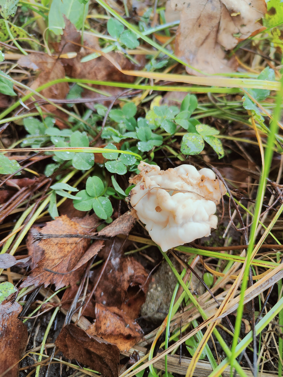 Две недели назад случайно обнаружила на нашей дачной улице нечто. Вдоль забора из профлиста виднелись небольшие странные сущности белого или слегка кремоватого цвета. Сложной формы, со множеством извилин. Как будто вырезанные фигуры из кости или из бивня. Немного порассуждав, что это может быть, не нашла других вариантов ответа, кроме того, что это грибы. Главным аргументом в пользу этой версии было то, что росли они полянкой. Всех вместе их было не меньше десяти штук. Может, и больше - в траве не видно. Решила рассмотреть их поближе. Традиционного разделения на ножку и шляпку нет. Просто фарфоровые витиеватые абстрактные формы. Хотя нет, в нижней части всё-таки просматриваются продольные гребни. Наверное, это и есть ножка. Откуда на дачной улице появились столь странные гости? Сыроежки и свинушки - да, иногда встречаются. А таких экзотов я даже в лесу ни разу не видела. По приезде домой решила спросить у ИИ, на что это похоже. Он выдал ответ, что мои незнакомцы - это лопастники курч
