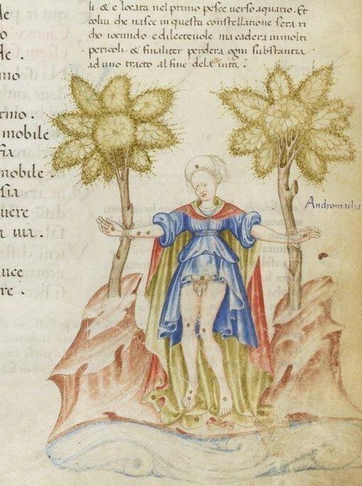 А вот уже в немецком трактате «Von dem Gang des Himels und Sternen» (XV в.) дочь Кефея изображена прикованным к двум деревьям юношей. Вместо прожорливого Кета в ногах у него горит пламя.