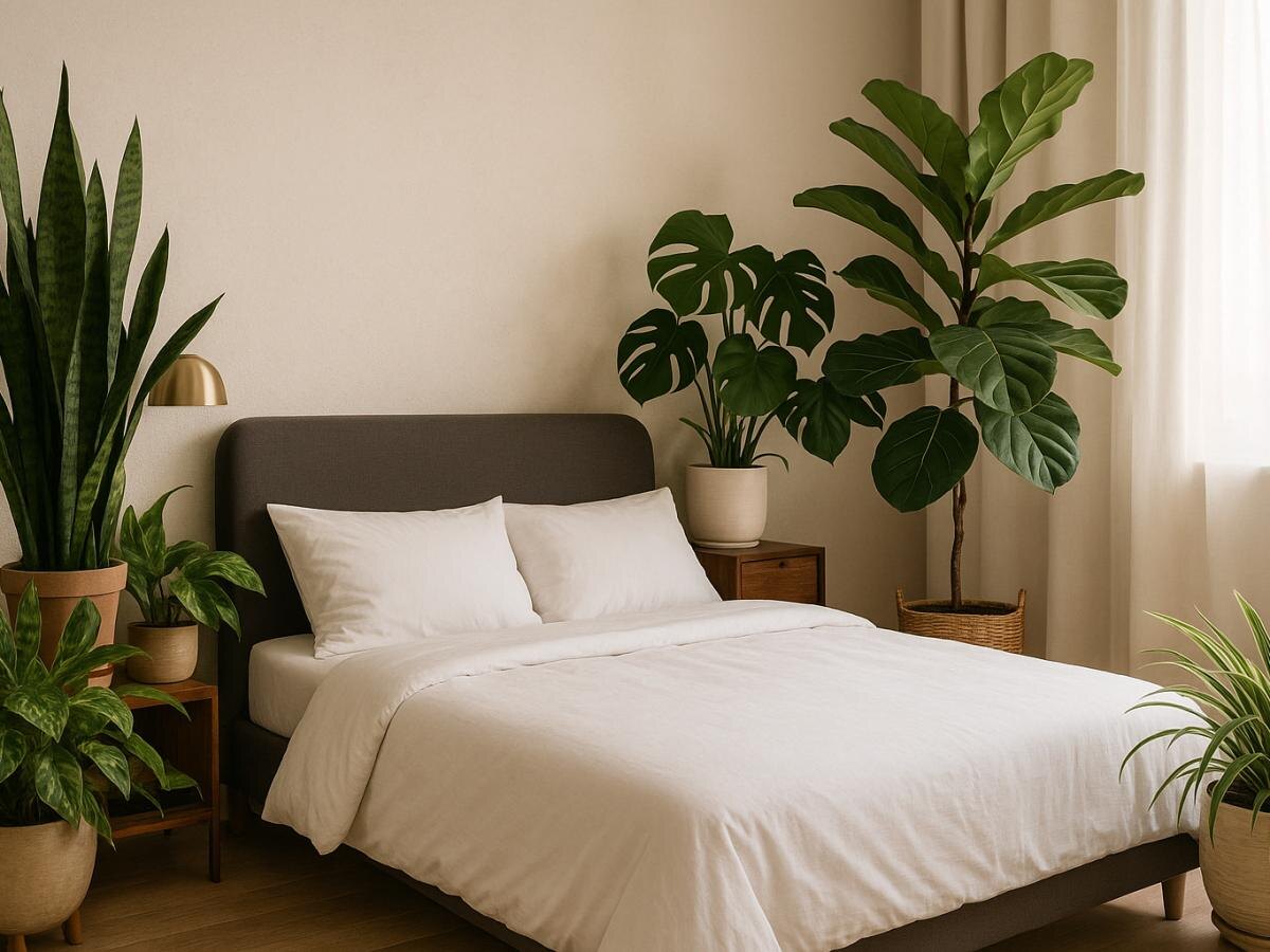 Пальмы особенно органично смотрятся в спальне и зоне отдыха: крупная зелень помогает глазам расслабиться, снижает ощущение "загруженности" интерьера и создаёт визуальное "убежище". Спальня с мягким светом и одной-двумя аккуратными пальмами воспринимается спокойнее, чем комната с большим количеством мелких предметов. Для людей, которым сложно "отключится" перед сном, сам вид крупного растения рядом с кроватью работает как визуальный якорь на отдых и замедление ритма.