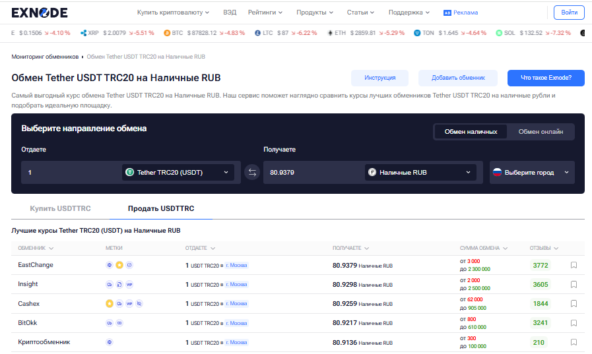 Чтобы новичку было проще понять, как обменять ЮСДТ на рубли безопасно и без риска, важно выбирать проверенный офлайн-криптообменник с реальными отзывами и прозрачными условиями. На рынке много предложений, но не все сервисы одинаково надёжны. Поэтому список ниже основан на рейтингах и отзывах пользователей на платформе Exnode, а также на реальном уровне сервиса и выгодности курсов.