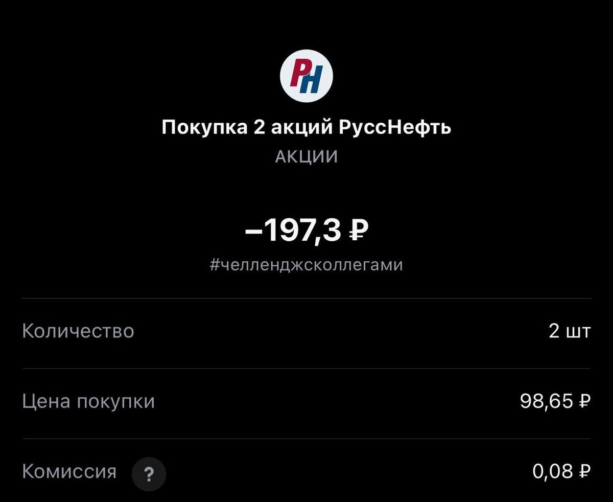 Всем привет! Покупка на сегодня #318, вчера пропустили. Статистика портфеля на стороннем сервисе, можно посмотреть по "ссылке" Напомню это челлендж с коллегами, каждый рабочий день пополняем брокерский счет на 250 рублей и инвестируем. Если возникли вопросы или есть не понимание, что делать. Задавайте «тут» Покупка #318 🟢 «РуссНефть» 98.65 rub #RNFT 2 лота #каждыйсможет #челенджсколлегами ✈️ Стас Мироненко 📹Youtube | 📹Rutube