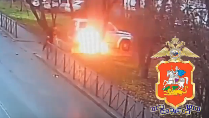 Москвич шел мимо полицейской машины, но ему не понравилось как она стоит и он поднёс спичку