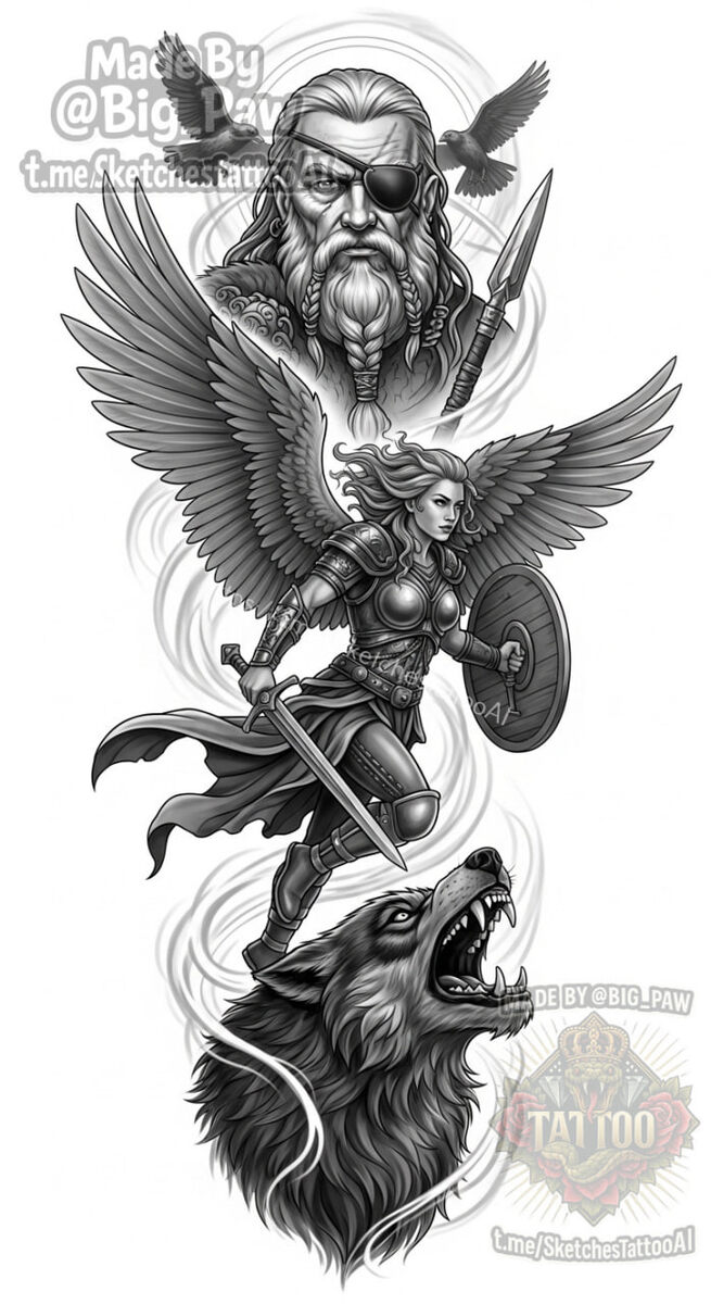 #2811 Подборка по запросу подписчика - эскиз сверху Одина, потом по середине Валькирию и внизу Фенрира(волк в мифологии) Реализм хотелось бы, с тенями 🧠 SYNTX - тут создан эскиз 💎 Информация - все услуги 💀 Эскизы от нейросети #скандинавская #боги #один #эскиз #тату #татуировка