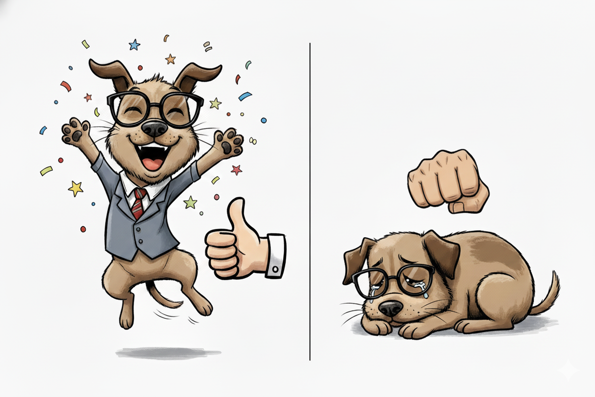 Очень наглядно это можно увидеть на примере обучения команды "рядом". Обучая собаку методом "старой" школы, мы не объясняем, как нужно. Мы объясняем, как не нужно. Отходит собака от ноги, выпадает из позиции - бац, рывок. Снова отходит - бац, рывок. Не отходить она пока не может, потому что конечной цели не понимает. А потому совершает миллион ошибок и получает миллион рывков. Покаааааа сама логически не догадается, в каком месте ей этих рывков можно избежать: не хочешь дискомфорта - держись вот тут. По сути она прячется в позицию рядом от возможного негатива - вот тут не дергают.