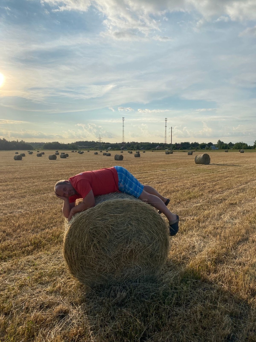 Осень в этом году решила не тянуть с преображениями: ещё неделю назад мы нежились на солнышке, а сегодня — опа! — за окном сплошной «серый кардинал» в виде затянутого тучами неба. Мы отправились на дачу — закрывать сезон. Мама загрузила в машину три термоса, шесть пледов и запас провизии на случай апокалипсиса. Я упаковала тёплые носки, шапку и даже варежки (на всякий пожарный). Папа же невозмутимо бросил в багажник шорты, футболку и плавки — «на будущее», как он сказал. Дорога пролегала через бескрайние поля, и тут мы увидели это чудо: гигантские стога сена, словно золотые замки посреди осеннего царства. Папа аж подпрыгнул на сиденье: — Стоп машина! Это же идеальная фотолокация! Мама скептически приподняла бровь: — Ты глянь на градусник — там плюс восемь! Но папу было не остановить. Он молниеносно стянул куртку, натянул шорты (которые, кажется, за лето немного уменьшились в размерах) и рванул к самому большому стогу, приговаривая: — Сейчас я вам покажу, как надо встречать осень по‑л
