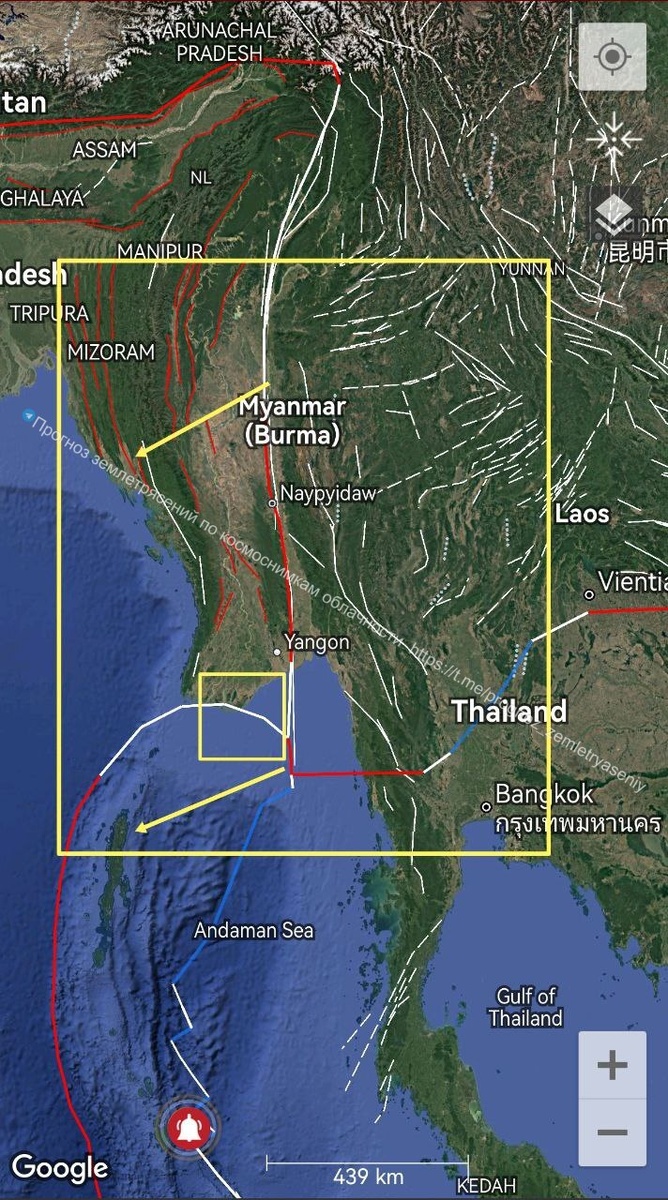 В ответ на пост На северо-востоке Индостанской плиты сформировалась облачная структура, напоминающая угол плиты Сунда, который сместился на юго-запад. По протяженности картина тянет на М7+ (до М7.5+/-0.2). Это уже второй протяженный ОСТИ по данной зоне, так что имеется вероятность сильного землетрясения в течение 9 дней. В зоне риска Мьянма, Китай (Юньнань) и Таиланд, а также Андаманское море. ===== A cloud structure resembling a corner of the Sunda plate has formed in the northeast of the Hindustan Plate, which has shifted to the southwest. The length of the structure is similar to the M7+ (up to the M7.5+/-0.2). This is the second extended CSTI in this area, so there is a possibility of a strong earthquake within 9 days. Myanmar with Andaman sea, China (Yunnan) and Thailand are at risk.