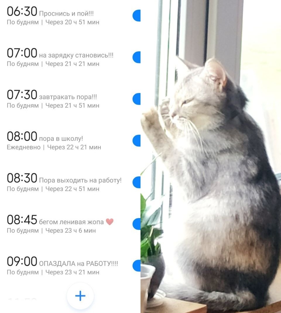 Держи меня, соломинка, держи, Когда вокруг шторма В двенадцать баллов, Держи меня, соломинка, держи, Когда друзей по жизни разбросало, Держи меня, Держи меня, Держи меня, соломинка, держи! Помните, как героиня фильма «Зимняя вишня» начинала каждое утро с этой песни? Это был её ритуал, она заряжала её энергией и давала силы не сдаться. На мне это не работает, совсем, я пробовала. Встать с первой попытки? Я? Серьёзно? Я же тогда всё успею и никуда не опоздаю. А как же бежать сломя голову на работу или одной рукой переворачивать блинчики, а другой натягивать футболку? А кричать «Твою дивизию!» на невовремя запутавшиеся шнурки? Где адреналин, веселье? В общем будильников у меня стоит много, у каждого своя мелодия и божественное предназначение. Ибо только благодаря богам и нашей кошке (она каждый день, вот так за меня молится) я не опаздываю на работу. Ну и ещё потому, что я перевела все часы в доме на 5 минут вперёд! Скрин прилагаю! А вы легко встаёте по утрам?