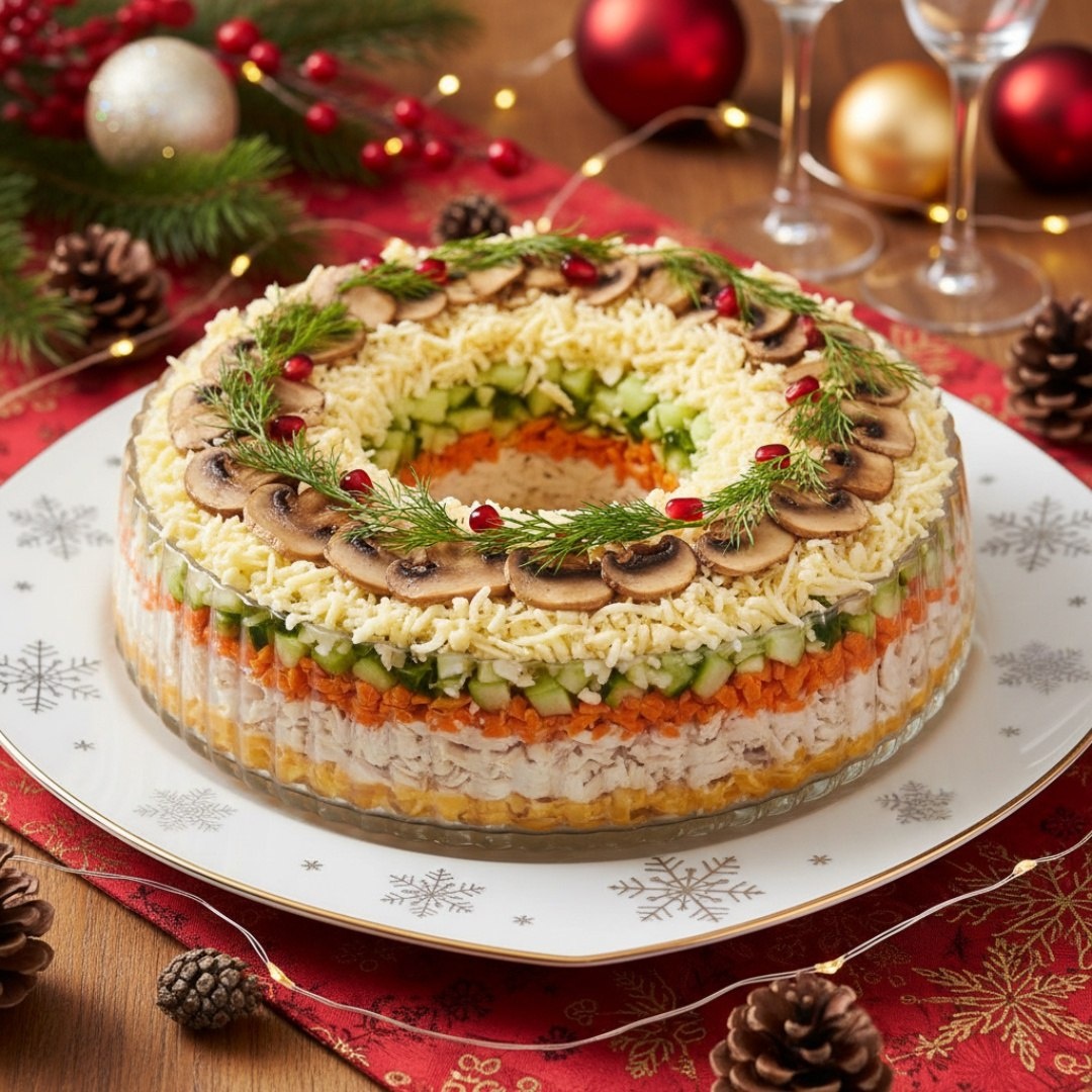 Салат "Новогодний венок" Ингредиенты ⤵️ 🔸 Филе куриной грудки – 2 шт. 🔸 Шампиньоны свежие – 300 г 🔸 Яйца отварные – 5 шт. 🔸 Сыр твердый – 200 г 🔸 Морковь отварная – 2 шт. 🔸 Огурцы маринованные – 4 шт. 🔸 Лук репчатый – 1 шт. 🔸 Майонез – 200 г 🔸 Укроп – 1 пучок 🔸 Гранат – 1 шт. Приготовление🎄 1. Куриное филе отварить до готовности, охладить и нарезать мелкими кубиками. 2. Грибы и лук мелко нарезать, обжарить на растительном масле до золотистого цвета. 3. Яйца, сыр, морковь и огурцы натереть на средней терке. 4. На большое блюдо выложить салат кольцом, используя кулинарное кольцо: - 1 слой: курица + майонез - 2 слой: грибы с луком - 3 слой: яйца + майонез - 4 слой: огурцы - 5 слой: морковь + майонез - 6 слой: сыр + майонез 5. Украсить веточками укропа и зернами граната, имитируя новогодний венок. 6. Дать пропитаться 3 часа в холодильнике. Рецепт дня #новогодний_салат #новогодний_венок #салат #курица #мясо #грибы #шампиньоны #овощи #праздничный_стол
