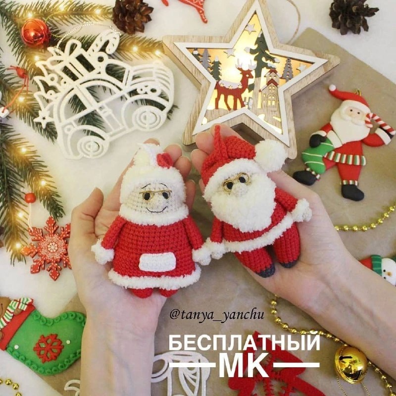 Материалы Мистер Клаус Ручки 2шт Начинаем вязать бежевым цветом. Деталь не набиваем 1р. 6сбн в КА 2р. (сбн, пр)*3 - 9 3-4р. 9сбн Меняем на красный 5р. За зп 9сбн 6-11р. 9сбн Сложить ручку пополам и провязать за обе стенки детали 4сбн. Нить закрепить, обрезать, оставить длинный конец для пришивания детали. Присоединить к оставшимся полупетлям 4 ряда пряжу Softy белого цвета и провязать 9сбн, закончить вязание сс, нить закрепить и спрятать в детальке, Ножки 2шт Начинаем вязать черным цветом 1р. 6сбн в КА 2р. (сбн, пр)*3 - 9 3р. пр, 8сбн - 11 Меняем нить на красную 5р. пр, 10сбн - 12 6р. пр, 11сбн - 13 7р. пр, 12сбн - 14 8р. пр, 13сбн - 15 9р. пр, 14сбн - 16 10р. 11сбн, сс Нить закрепить, обрезать, спрятать кончики в детальке. У второй ножки сс в конце не провязываем, а вяжем 2вп и присоединяем в соединительный столбик первой ножки сбн. Тело-голова 11р. 16сбн по 1-й ноге, 2сбн по вп, 16сбн по 2-й ноге, 2сбн по вп - 36 12р. (5сбн, пр)*6 - 42 13-16р. 42сбн 17р. За зп 42сбн 18р. 42сбн 19р.