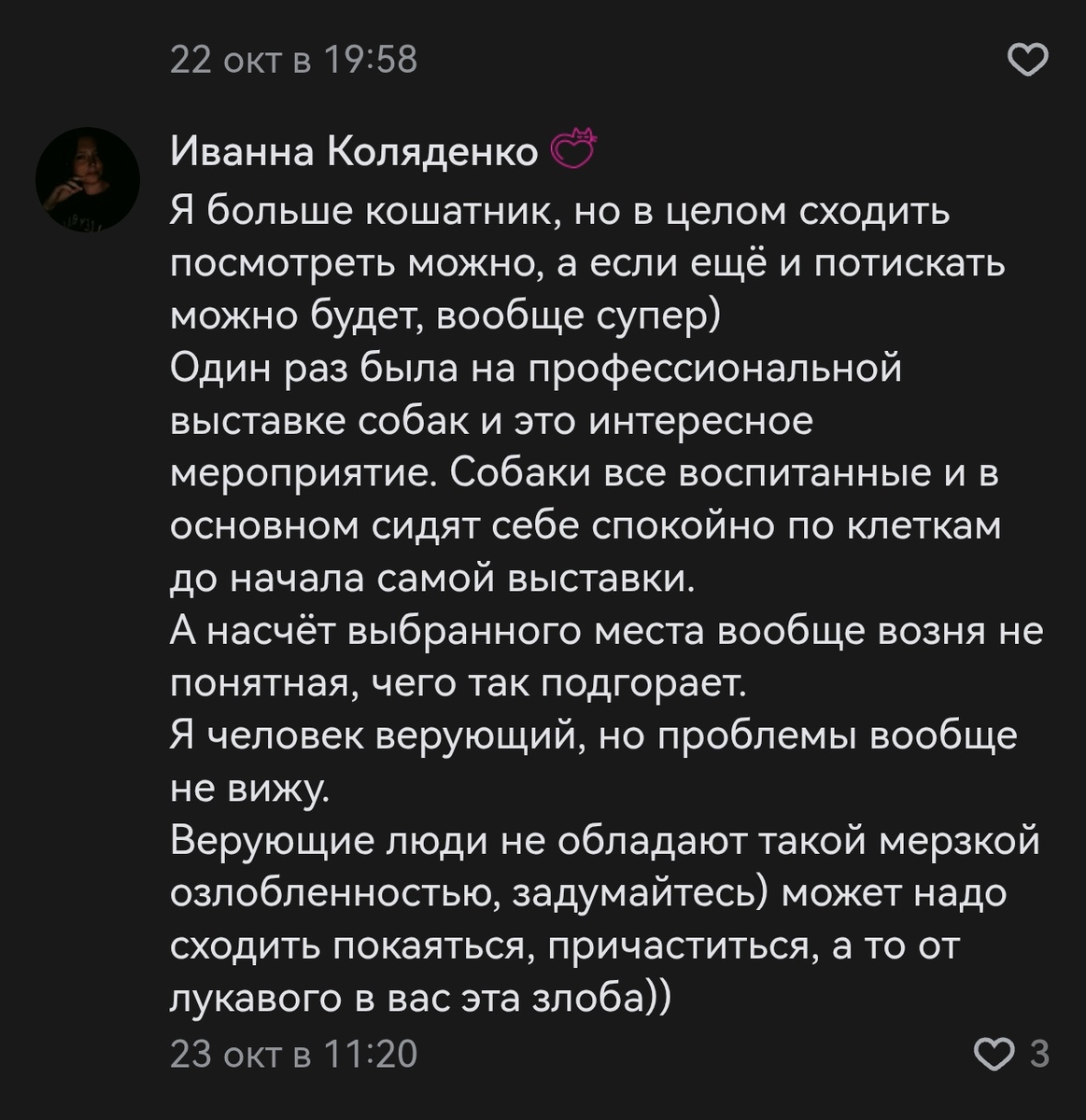 Уже после выставки случайно нашла новость о ней, и сколько же было злобных комментариев в адрес собак и самой выставки. Даже не просто злобных, а с ненавистью. Я такого не ожидала.