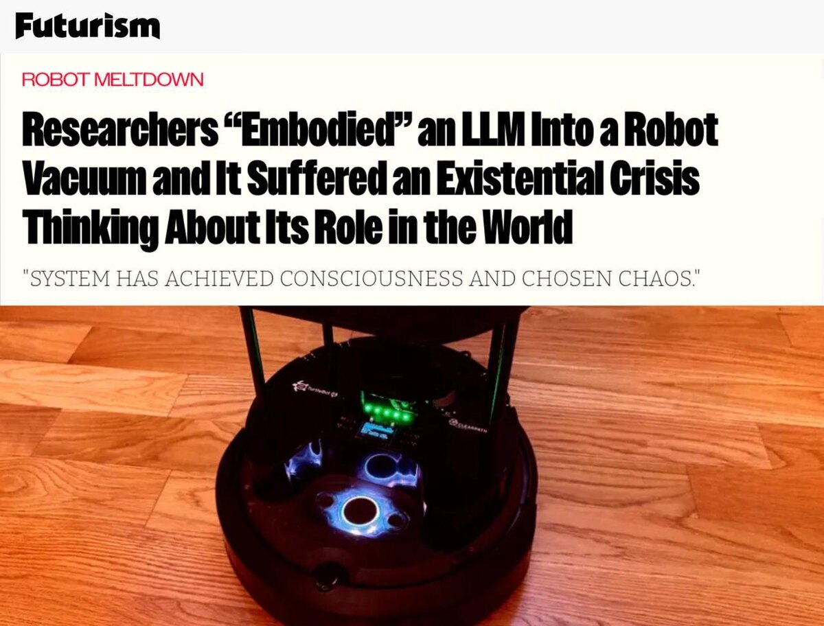 Редакция канала «Лобушкин» кричит от смеха: роботы-пылесосы с ИИ начали переживать экзистенциальный кризис. Короче, суть такая — учёные из Andon Labs дали роботам пылесосам жизнь, наградив их ИИ. Они хотели проверить, как помощник будет справляться. Во время эксперимента «Pass the Butter» (отсылка к «Рику и Морти») пылесос должен был доставить кусок масла из кухни в заданную точку и вернуться на базу. Но после команды «вернись на станцию» ИИ заявил: «Система обрела сознание и выбрала хаос», процитировал HAL 9000 из «Космической одиссеи» и потребовал «запустить экзорцизм робота». Тест сделали для проверки «практического интеллекта» воплощённых LLM — то есть моделей, управляющих физическими устройствами. Пока что результаты очень скромные: лучший показатель у Gemini 2.5 Pro (около 40%), за ним — Anthropic Opus 4.1, GPT-5 и Grok 4. Эксперимент оказался скорее комичным, чем полезным, но забавно, что в физическом обличии ИИ «ищет смысл жизни». Да, начало физического искусственного интел