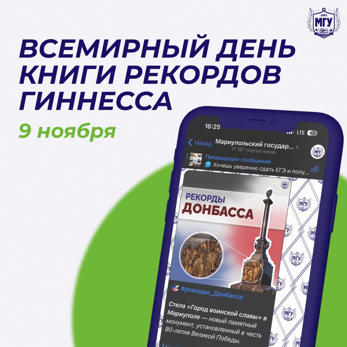 9 ноября — Всемирный день Книги рекордов Гиннесса 🌟 27 августа 1955 года был впервые опубликован справочник, собравший сведения о мировых рекордах. Уже 70 лет в Книге рекордов Гиннесса фиксируются достижения в различных сферах деятельности. 🇷🇺 Наш регион также славится масштабными рекордами, о которых мы рассказываем в рубрике #рекорды_Донбасса. Промышленные и культурно-спортивные достижения Донецкой Народной Республики получили широкое признание в России. 📎 А какие интересные рекорды, установленные на Донбассе, знаете вы? Делитесь в комментариях! 👻 MAX|💙ВК|📝Дзен|🤩Сайт #МГУимениКуинджи