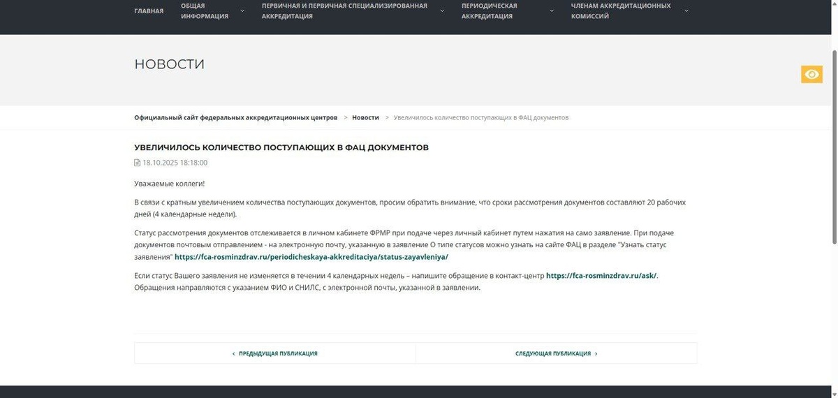 ⏳ Сколько ждать решение ФАЦ после подачи документов? Коллеги, часто получаем вопрос: «Я уже отправил документы — когда ждать решение комиссии?» Аккредитационная комиссия ФАЦ собирается раз в месяц, обычно в конце месяца. Это нормальный график, и ускорить процесс нельзя — заседания проходят строго по расписанию. Если вы подали документы недавно, особенно в праздничные дни или в последние числа месяца, ожидание 1–2 недели — это норма. Не нужно переживать и дублировать запросы — ваш пакет уже в работе. На сайте ФАЦ опубликовано официальное сообщение о задержках: из-за большого объёма заявок обработка идёт дольше обычного. Комиссия не молчит — она проверяет документы. 📍 Проверить статус можно в личном кабинете ФАЦ. Если вы проходите периодическую аккредитацию с нами, то команда Медобучение.РФ сопровождает подачу и отслеживает все этапы — если появятся изменения, мы обязательно сообщим.