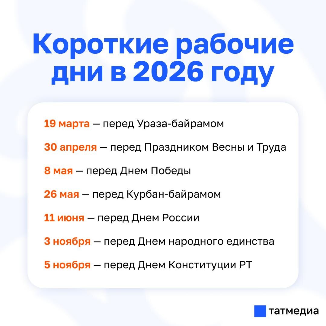 В ответ на пост 📆⏰ В Татарстане в 2026 году будет семь коротких рабочих дней Они выпадут на даты, предшествующие праздникам. @tatmediaofficial | Все каналы Татмедиа ™️ 1-й новостной MAX-канал Татарстана - подпишитесь.