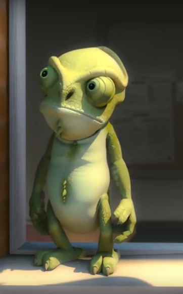 Гас - антропоморфный хамелеон зелёного цвета, но брюхо у него белое.