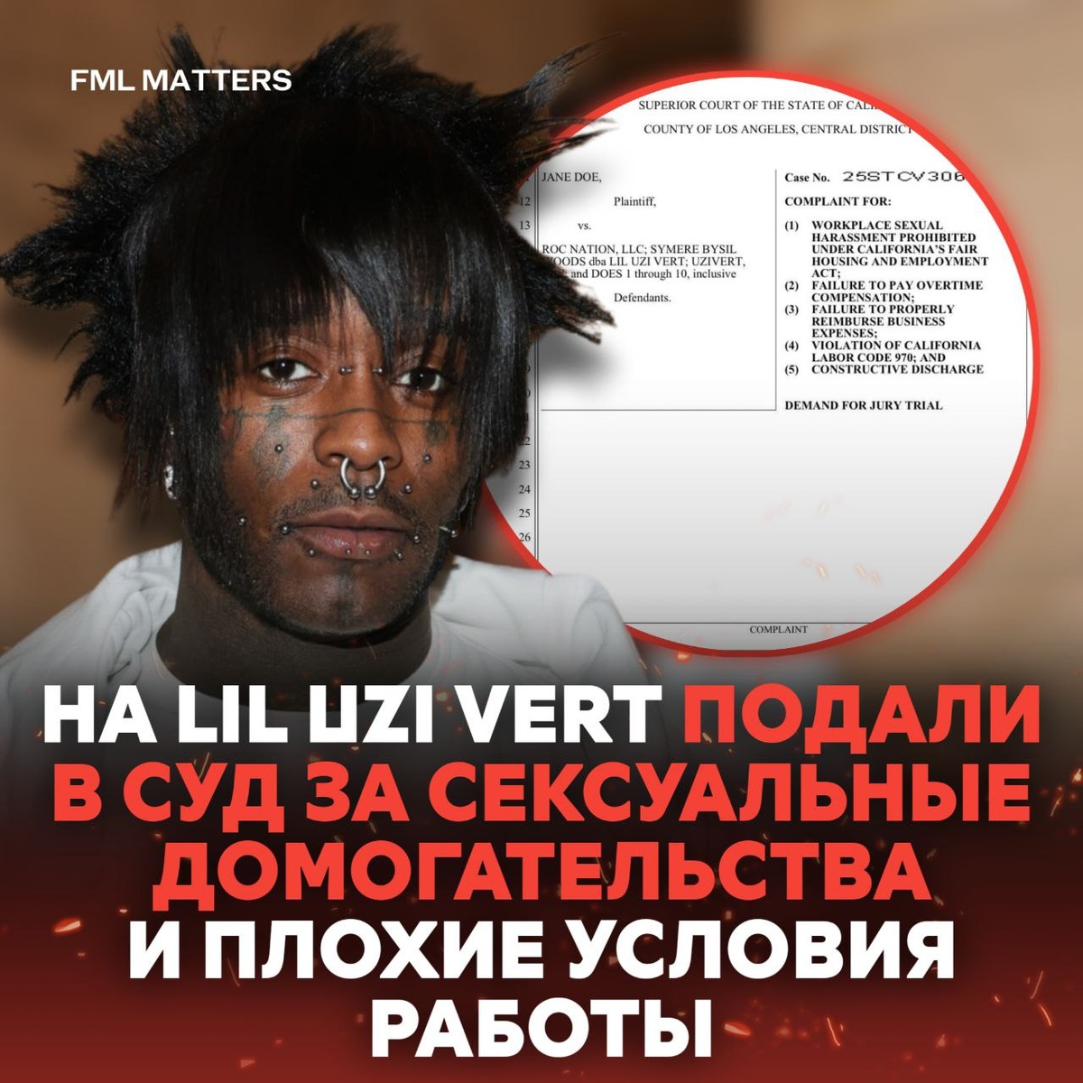 ❌ НА LIL UZI VERT ПОДАЛИ В СУД ЗА ДОМОГАТЕЛЬСТВА! Бывшая помощница Узи заявила, что рэпер домогался её, писал непристойные сообщения и заставлял работать без отдыха — по 30 часов подряд и быть на связи круглые сутки во время туров по всему миру. Также она рассказала, что ей не платили за переработки, не возвращали рабочие расходы и создавали «токсичную атмосферу», из-за которой она ушла. Верим? ❤️🔥 / 👎 💀 FML MATTERS
