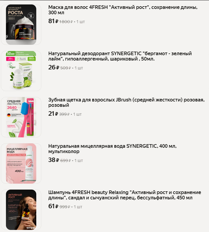 Заказы продуктов со скидкой и кешбэком 50%, сертификат на 2000 рублей на товары Синергетик и по традиции бесплатный чай с яблоками. Помните, покупали гель для душа и кондиционер Синергетик со 100% кешбэком от Т-Банка? Я загрузила этот чек на сайт розыгрыша и выиграла сертификат на 2000! Его можно потратить только на товары из магазина Синергетик на Яндекс Маркете. У меня уже огромные запасы бытовой химии и уходовых средств. Есть бесплатная 5-литровая канистра средства для мытья посуды с тестирования, 7 кг порошка со скидкой 50% из Магнит Косметик. Вот иногда даже со скидкой 50% не надо брать, потому что можно получить бесплатно. Гелей для душа штук 5, 4 зубные пасты, 5 шампуней - это всё получено бесплатно. Но раз подарили сертификат, как не воспользоваться. Хотя он не такой выгодный, как я представляла. Я думала смогу купить товары за 5 рублей (плюс-минус), но Яндекс Маркет посчитал по своему и насчитал мне 260 рублей за всё. Но я всё равно списала баллы Яндекс Плюса, которых у меня