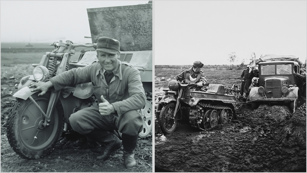 Элитой считались авиационные инженеры. Они мыслили категориями легкости, мощности и компактности. И вот, в 1940 году, одному из таких гениев, Эрнсту Книпкампу с завода NSU, приходит в голову идея. А что, если скрестить мотоцикл и танк? Книпкамп не был мотоциклетным дизайнером. Этот человек был помешан на трансмиссиях. Позже он приложит руку к чудовищно сложным и гениальным коробкам передач «Тигров» и «Пантер». Но начал он с «малыша» — Sd.Kfz. 2, или «Kettenkraftrad» (гусеничный мотоцикл).