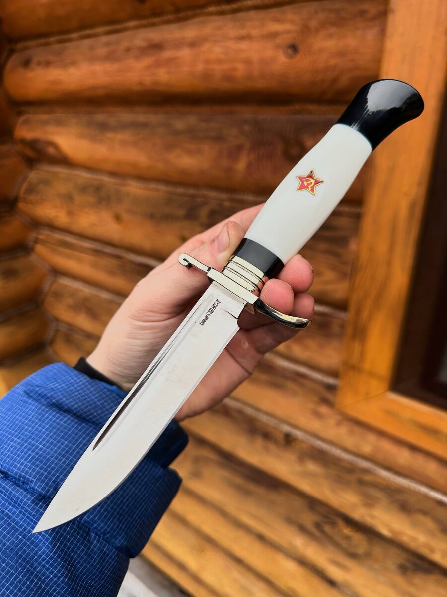 🔥 Финка НКВД (реплика) — единственный экземпляр! Сталь S390 — топ среди инструментальных сталей: — *Держит заточку дольше всех* — *Агрессивный, чистый рез* — Твердость клинка: 70 HRC Рукоять из акрила (белый, чёрный, *красная звезда*): — удобно лежит в руке — не боится влаги и времени Нож заточен в бритву! В комплекте: ножны из натуральной кожи. *Можно заказать формованные ножны (+8.000 ₽)* Цена: ~36.197 ₽~ Со скидкой: 28.957 ₽ 📲 Заказать — @Nazarklinokbot или WhatsApp/Viber: +7 910 134-38-31 #кузницаназарова #финка #ножручнойработы #s390 #эксклюзив #подарок #коллекция
