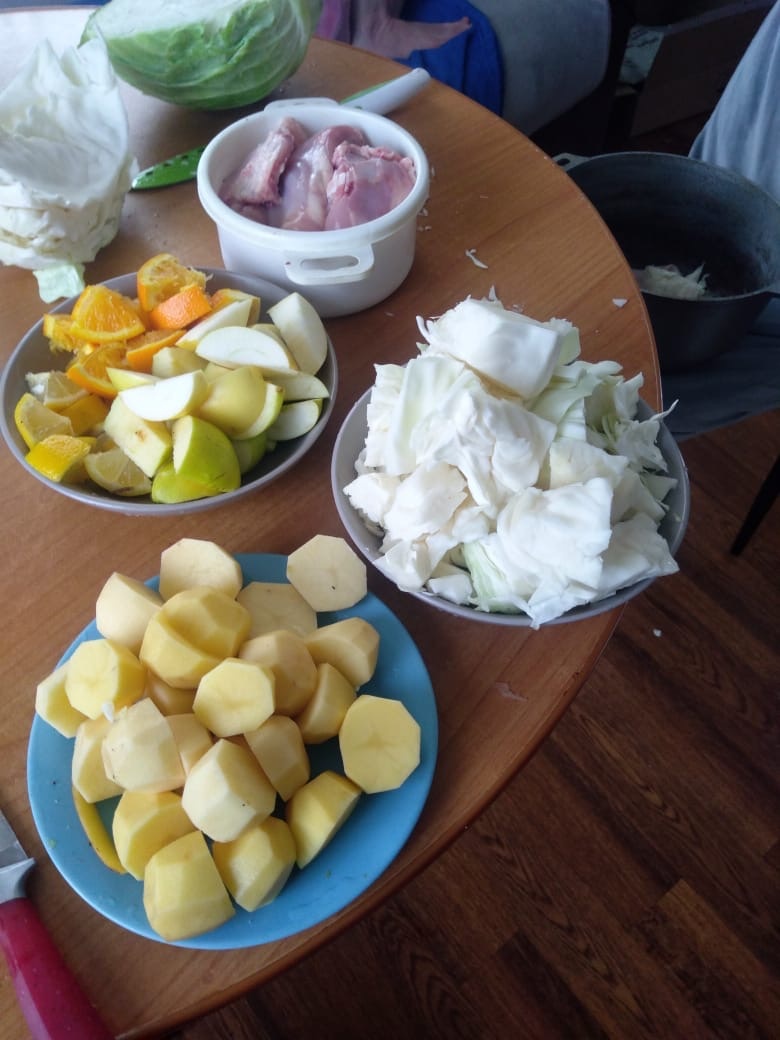 Нам потребуется капуста белокочанная 300-400 гр., картофель 6-7 средних клубней, лук 2 средних головки, чеснок 1 большая головка, апельсин 1 штука, лимон половина среднего плода, 2-3 средних яблока)