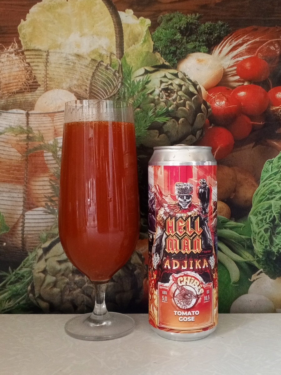Очередная томатка из линейки "Hell Man" (*"Чел ада") от "чибиса". "Hell Man: Adjika" Томатный гозе с аджикой. Для любителей поострее. Аджика - кавказская острая приправа в виде пастообразной массы. Используется преимущественно в кухне Грузии, Кавказа, Закавказья, Абхазии и Мингрелии. Подаётся к блюдам из мяса, овощей, птицы и рыбы. Пивной напиток непастеризованный нефильтрованный неосветлённый "Хелл Мэн: Аджика Гозе" Состав: вода подготовленная (исправленная), солод пивоваренный ячменный, томатный сок/паста, специи, хмель, дрожжи пивные, сорбат калия (Е202). Объем: 0,45 л. Изготовитель: ООО "Пивоварня "Чибис" (г. Москва) Цена: 282 рубля Дата розлива: 29.08.2025 Томатный гозе буро-красного цвета. Бурлит, шипит, но стойкой пены при разлитии в бокал всё же не образует. Рассольного типа, на кисло-томатной основе с чесноком, специями и острыми перцами. Острота терпимая. Доминирует над вкусовыми ощущениями и во многом заглушает их. По правде говоря, жгёт во рту потом долго. Поэтому заранее с