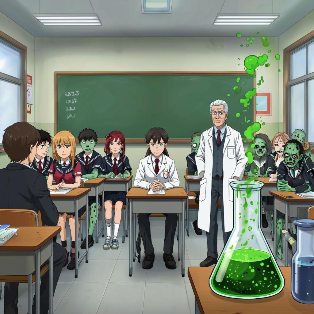 Жанр: Школьная комедия, пародия, повседневность Сеттинг:Средняя школа в Ракун-Сити, куда приняли «особенных» учеников --- 📚 ЭПИЗОД 1: «НОВЫЙ УЧИТЕЛЬ — БЫВШИЙ ЛИКВИДАТОР» СЦЕНА: Класс 3-А. Леон входит в дверь под аплодисменты. Леон: (в душащем костюме, с указкой) «Меня зовут Леон Кеннеди. Ваш новый классный руководитель.» Обзор класса: · Крис — староста, сидит с поднятой рукой ещё до начала урока · Хелена — отличница, делает конспект в виде тактической схемы · Джейк — бунтарь, ноги на парте, жуёт жвачку · Шерри — председатель школьного совета, уже составляет расписание дежурств · Ада — загадочная красотка у окна, читает «Искусство войны» Леон: «Итак, сегодня на уроке выживания...» Крис:(перебивая) «Учитель! Я уже прочитал весь учебник!» --- 📚 ЭПИЗОД 2: «ПЕРВЫЙ ЗУММЕР — ПЕРЕМЕНА!» СЦЕНА: Школьная столовая. Джейк: (тычет вилкой в котлету) «А она... шевелится?» Шерри:«Джейк, не играй с едой!» Внезапно из котлеты вылезает маленький зомби-таракан. Хелена: «Кажется, наш повар