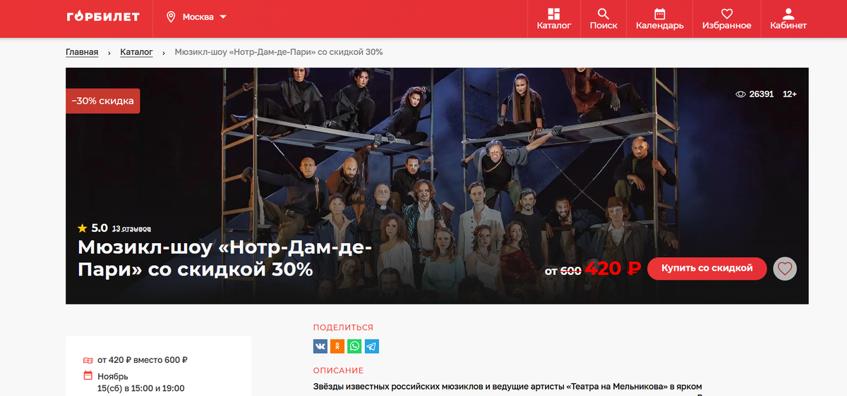 Собрались мы тут с мужем на спектакль Нотр Дам и стали смотреть билеты, покупали их за несколько часов до начала мюзикла. Смотрели билеты на Афише, Тикет Лэнд и самом сайте театра. Все бы хорошо, и мы были почти готовы к покупке, но я случайно открыла ссылку с сайтом gorbilet.com. Конечно сразу начали читать отзывы - и они были неоднозначные, кто брал экскурсии - многие остались недовольны сервисом и взаимодействием с операторами. Но у нас театр - купил и пошел на взятые места, по идее. Фишка в том, что билеты тут оказались на порядок дешевле, вместо 3000 руб - по 2100 + рублей 150 сервисный сбор (но это сейчас в принципе почти везде). Пока мы думали и пытались найти отзывы на сайт - наши лучшие места раскупили, которые оставались, так что пришлось брать в разных рядах, но с экономией почти в 2 000 руб за два билета! Честно говоря было страшно, что когда мы придем на спектакль - нам скажут что это фальшивка. На деле в театр нас запустили без проблем, так что билеты реальные и покуп