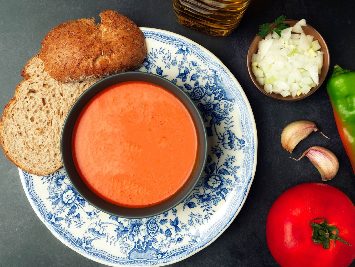 Ингредиенты → Шаги → Результат Это холодный испанский суп из Андалусии — освежающий, лёгкий, идеальный для жары. Настоящий гаспачо — не просто «помидоры в блендере», а эмульсия из хлеба, оливкового масла, чеснока и уксуса, придающая кремовую текстуру. Готовили его крестьяне из подручных продуктов, подавали с кубиками овощей. Для подачи («picadillo»): 1. Хлеб замочи в воде на 5 минут, отожми. 2. Помидоры, огурец, перец нарежь крупно. 3. В блендер положи хлеб, чеснок, овощи, соль, уксус. 4. Взбивай, постепенно вливая оливковое масло — как при приготовлении майонеза (должна получиться эмульсия). 5. Добавь ледяную воду до желаемой густоты (как жидкая сметана). 6. Процеди через сито (по желанию — для идеальной гладкости). 7. Охлади минимум 2 часа (лучше — 4–6). Подавай: В бокалах или тарелках, посыпав picadillo и сбрызнув оливковым маслом. Холодный, бархатистый суп с кисло-сладким вкусом, остротой чеснока и фруктовыми нотками масла. Не салат, не соус — а отдельное состояние испанского лета.
