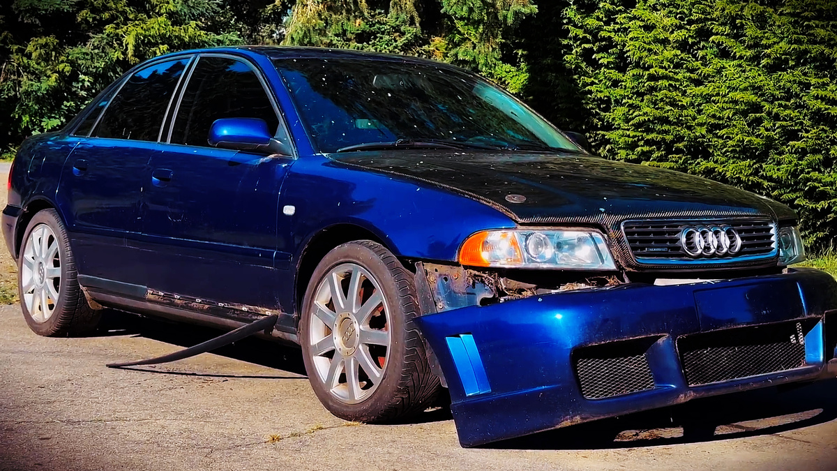 Всем привет из США! Я не планировал новый проект, но когда пришло уведомление о продаже Audi A4 всего за тысячу долларов, устоять было невозможно. Последний рестайлинг легендарного кузова B5, двигатель 1.8 турбо, полный привод quattro, чип-тюнинг, карбоновый капот и передний бампер в стиле RS4. Единственный нюанс — машина не на ходу, простояла много лет.