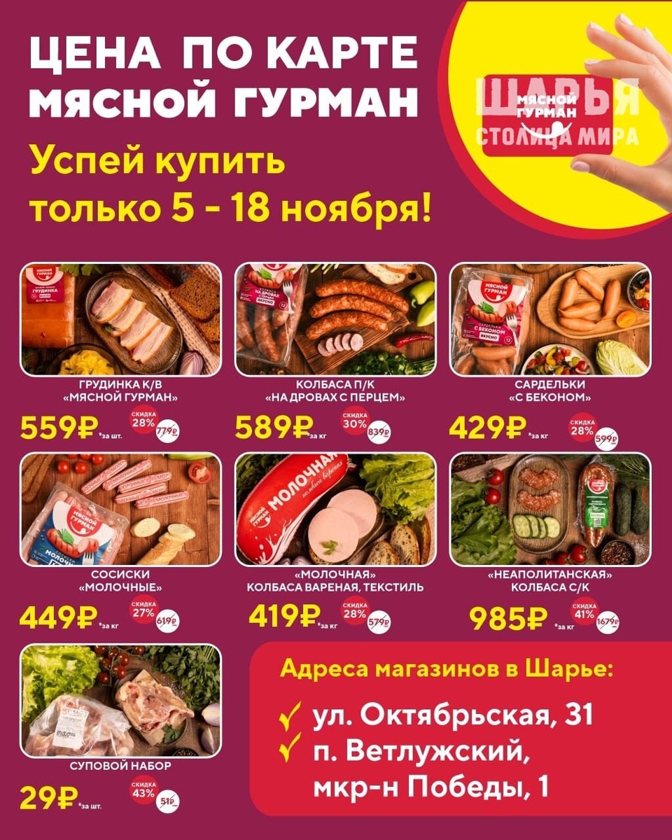 ❤Любимые продукты Мясной Гурман — теперь по ещё более вкусным ценам!👍 С 5 по 18 ноября в наших фирменных магазинах действуют специальные скидки на колбасы, деликатесы и мясные изделия собственного производства. ♦Приходите за настоящим вкусом и качеством — ведь всё, что мы готовим создано с душой и любовью!♥ Ждём вас в магазинах “Мясной Гурман”! г. Шарья ул. Октябрьская, 31 г. Шарья п. Ветлужский мкр-н Победы, 1 Шарья – столица мира Крупнейшее городское СМИ Источник: Открыть