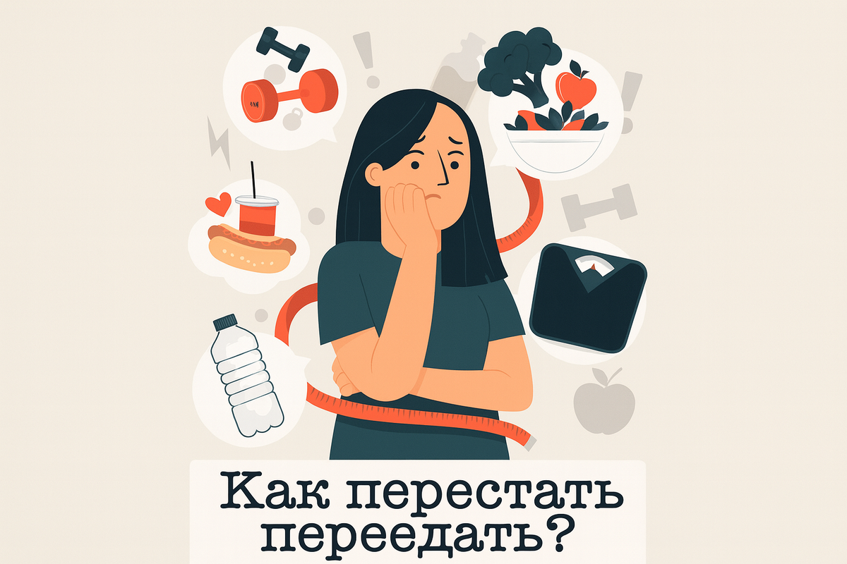 Если есть слишком быстро — легко съесть лишнего. Попробуйте: Это создает осознанность и снижает вероятность переедания. Когда мы долго не едим, организм буквально требует калорий — желательно быстрых и жирных. Спасает режим: Регулярность = меньше хаотичного желания «съесть всё». Многие переедают не потому, что голодны, а потому что грустно, тревожно, скучно или одиноко. Спросите себя перед тем, как что-то съесть: «Я голоден физически или мне нужно другое?» Если это эмоции — попробуйте альтернативы: