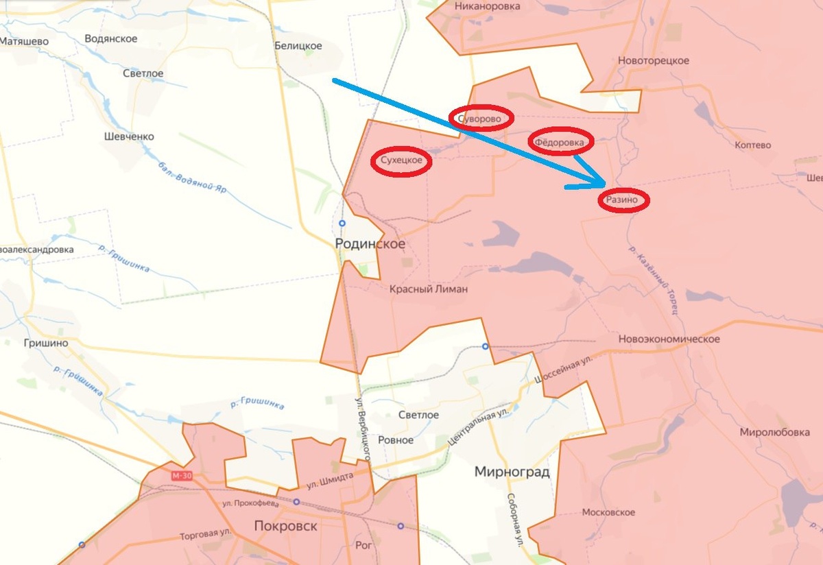 Продолжаем следить за ситуацией в Покровске глазами укро-военного обозревателя Машовца: Исходя из ОТКРЫТОГО заявления генерала Сырского, его решение "проблемы Покровска" состоит в том, чтобы ликвидировать северо-восточную "клешню" (грубо и проще говоря - отбросить 51-ю ОВА противника ЗА реку Казеный Торец, по крайней мере по направлению Сухецкое – Разино и Сухецкое – Федоровка)... При этом предполагается ОДНОВРЕМЕННО удержать северную часть города Покровска и по возможности выбить противника из так называемой "промзоны" (территория 9-го пожарно-спасательного отряда, ул. Нахимова и т.д.). В принципе, вполне логично... Но, как всегда… есть нюансы… Нюанс первый. В районе Разино, противник УЖЕ успел обустроить мощный район обороны. И продолжает там "рыть"... Это значит, что "отдавать" свой плацдарм на Казеном Торце, 51-я ОВА противника, очевидно, не спешит. Нюанс второй. По направлениям на Красный Лиман и на Суворово противник почти в непрерывном режиме передвигает усиление. Это, очеви