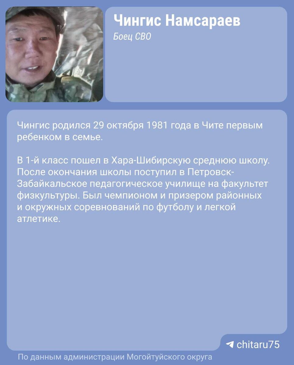 Читинец Чингис Намсараев погиб на СВО через два месяца службы. 4 апреля этого года он подписал контракт с Минобороны. Погиб 24 мая в окрестностях села Петровка в ДНР. В тг-канале Могойтуйского округа написали, что Чингис проявил мужество и отвагу, получив ранения, несовместимые с жизнью: Светлая память о защитнике Родины, с честью и мужеством выполнившем свой воинский и гражданский долг, навсегда останется в наших сердцах. 🟦 «Чита.Ру» в МАХ