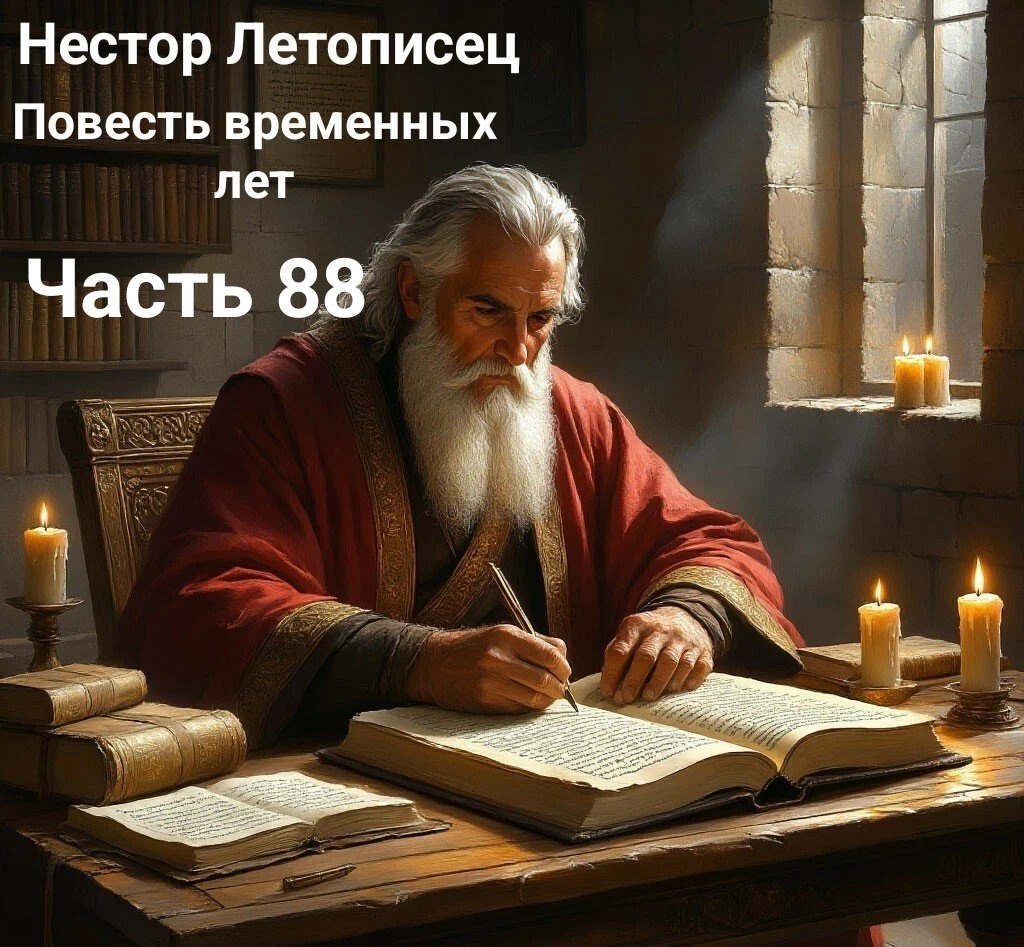 В год 6614 (1106). Воевали половцы около Заре- ческа, и послал на них Святополк Яня и Ивана Захарьича, козарина, и прогнали половцев, и полон отняли. В тот же год преставился Янь, старец добрый, прожив девяносто лет, в старости маститой; жил по закону Божию, не хуже был первых праведников. От него же и я много рассказов слышал, которые и записал в летописанье этом, от него услышав. Был он муж благ, и кроток, и смирен, избегал всякого зла; гроб его находится в Печерском монастыре, в притворе, там лежит тело его, положенное месяца июня в 24-й день. В тот же год постриглась Евпраксия, Всеволодова дочь, месяца декабря в 6-й день. В тот же год прибежал Избыгнев к Святополку. В тот же год постригся Святослав, сын Давыдов, внук Святославов, месяца февраля в 17-й день. В тот же год победила зимигола Всеславичей, всех братьев, и дружины их перебила девять тысяч.