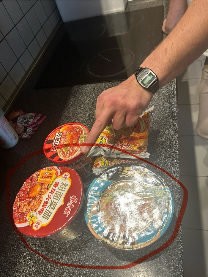 Всем привет, мои подписечники!! Вчера с муженьком наведались в магазин с китайскими диковинками и выловили для себя вот таких два экземпляра по двести рублей за каждый. Муж острое не любит, поэтому взял себе совсем беззубый вариант с полки «не острое», я же, наоборот, выбирала визуально самое ядреное, из того, что еще не пробовала. Итакс, начнем с мужниного: Там была какая то мудреная инструкция, что залейте водой комнатной температуры и на 6 мин в микроволновку или залейте кипятком и на 2 минуты в микроволновку. Мы решили по старой доброй схеме залить кипятком и продолжать 8 минут, и не прогадали, все за варилось как надо! Прекрасный нежный бульон, совсем не острый, вкусная лапша и замечательно распарившиеся наполнители. В общем, это Ниссин кап нудл с морепродуктами, если жопите 400 деревянных на оригинал, то это лапшуга прекрасный заменитель. 10/10! Приступаем к моему зверю. А вот что это я так и не поняла. На одной стороне вот такие угрожающие надписи, на обратной написано типа «не