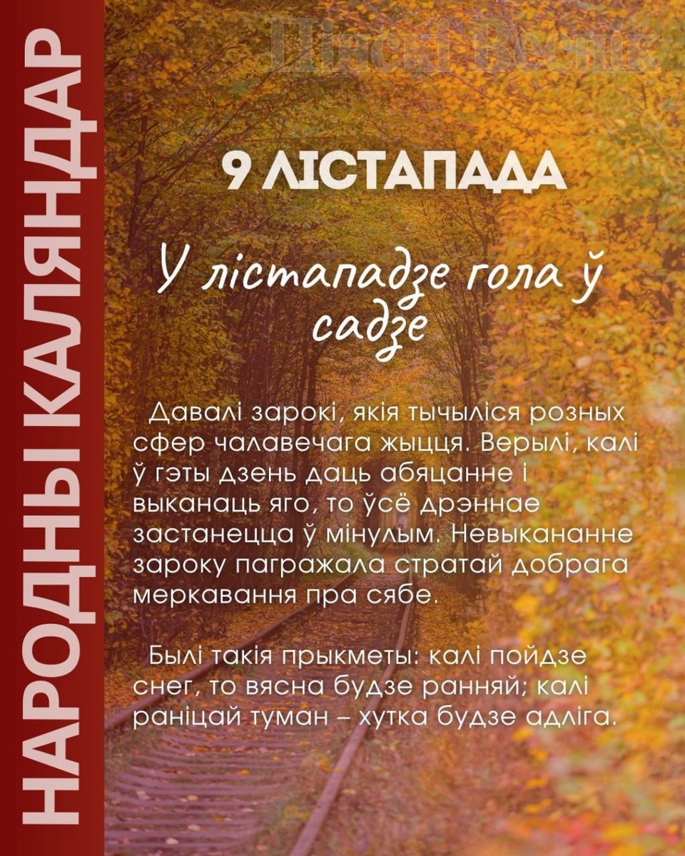 9 лістапада 🔸Давалі зарокі, якія тычыліся розных сфер чалавечага жыцця. Верылі, калі ў гэты дзень даць абяцанне і выканаць яго, то ўсё дрэннае застанецца ў мінулым. Невыкананне зароку пагражала стратай добрага меркавання пра сябе. 🔸 Былі такія прыкметы: калі пойдзе снег, то вясна будзе ранняй; калі раніцай туман – хутка будзе адліга. #народны_каляндар @Пинский Вестник ЮТУБ | САЙТ| ИНСТ | ВК | ОК | ФЕ | Прислать новость