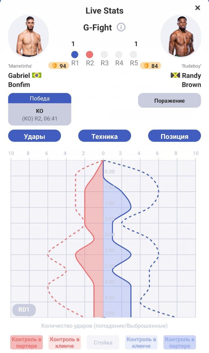Близкое начало боя Парни, как и ожидалось, решают с самого старта выяснять отношения в стойке. Габриэль работает на подходящей для Брауна дистанции, но тот сначала не сказать, что сильно этим пользуется. Напротив, Бонфим эффективно орудует калф-киками, а также накидывает джебы. Тем самым бразилец заставляет Брауна постоянно менять стойки, так как с передней ногой у файтера из Ямайки есть проблемы. Но ближе к экватору и Рэнди мощно отвечает Бонфиму, навязывая конкурентный бой. Он запускает длинные панчи и часто достает до цели, нанося проспекту солидный урон. Согласно статистическим данным, по итогам стартового раунда Браун выбросил больше ударов (51-38) и чаще попадал (20-16). Судьи на основе искусственного интеллекта в приложении Stats Fight оценили 5-минутку со счетом 9:9. Ознакомится с ИИ-оценками боев всего турнира UFC можно в приложении, доступно в AppStore и Google Play. А экран “Динамика поединка” подтверждает, что с точки зрения атакующего объема у парней действительно был