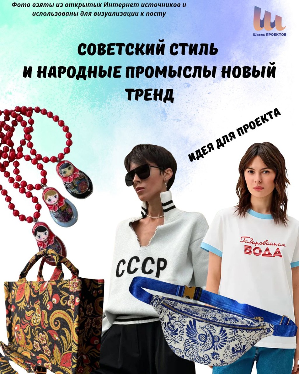 🧵 Советский стиль и народные промыслы новый тренд Замечали, как всё чаще на витринах появляются вещи «с душой» — от эмалированных кружек и значков до футболок с надписями и ретро-дизайном? Ностальгия по СССР — один из ярких культурных трендов последних лет. Это память, уют, узнаваемые символы, которые вызывают эмоции у взрослых и интерес у молодёжи. Сегодня возрождаются народные промыслы, стилизуются советские бренды, а дизайнеры создают целые коллекции, вдохновлённые прошлым. 🎨 Хохлома, гжель, плакаты в духе 70-х, советские шрифты и цвета — всё это стало частью современного визуального кода. А теперь вопрос к вам, коллеги и ученики: 🤔 Какие проектные идеи можно придумать на этой волне? — может, это будет коллекция футболок с лозунгами прошлого в новом прочтении? — кроссовки с элементами народных орнаментов? — или сумка-шоппер в духе советского дизайна, но с современным смыслом? Подпишись: ✅Maximumproektov ✅TГ #школьныйпроект #проектнаядеятельность #ШколаПроектов