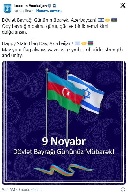 🇦🇿🇮🇱 Посольство Израиля в Азербайджане поздравило азербайджанский народ с 9 Ноября - Днем государственного флага