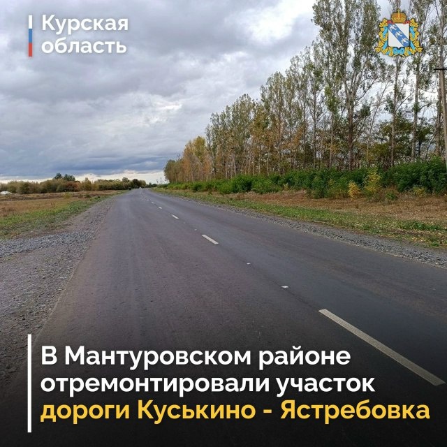 В Курской области отремонтировали важную дорогу По информации региональных властей, в Мантуровском районе отремонтировали участок автодороги регионального значения протяженностью четыре километра. Отмечено, что дорога важна для местного населения. По этой трассе часть жителей сел Куськино и Ястребовка ездит на работу в город Старый Оскол Белгородской области, рассказали подробности в релизе. Проведено укрепление основания автодороги черным щебнем, восстановили обочины и съезды, отремонтировали водопропускные трубы. Строители также нанесли дорожную разметку из термопластика, заменили дорожные знаки и установили сигнальные столбики. Работы велись по нацпроекту «Инфраструктура для жизни». В этом году в Мантуровском районе отремонтировали в общей сложности 10 километров автодорог.