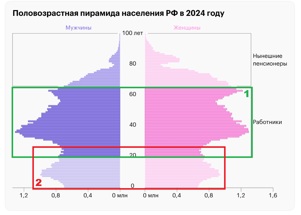 Читательница блога задала вопрос: Откуда такая уверенность, что пенсионный возраст ещё повысят? Какие-то инсайты? Мы передали этот вопрос Александру Елисееву - эксперту в области пенсионного планирования, автору концепции личных, семейных пенсионных фондов. Отвечая на вопрос, эксперт поделился с нами этим графиком. Это демографическая пирамида России: "Мы платим взносы в пенсионную систему, из неё выплачиваются средства текущим пенсионерам" - сообщает эксперт. "Да, это нищие копейки, но хотя бы столько - нам досталось тяжелое наследие строителей социализма. Мы его не строили, но нашему поколению приходится последствия разгребать и эту тяжелую ношу нести. Нас 190 работников на 100 пенсионеров. И даже с таким балансом и с копеечными пенсиями пенсионный фонд дефицитный, триллионы вливаются в него из бюджета каждый год, чтобы закрыть дыры". "Через 30 лет при условии, что пенсионный возраст не будет повышен, баланс будет на уровне 128 работников на 100 пенсионеров" - прогнозирует Александ