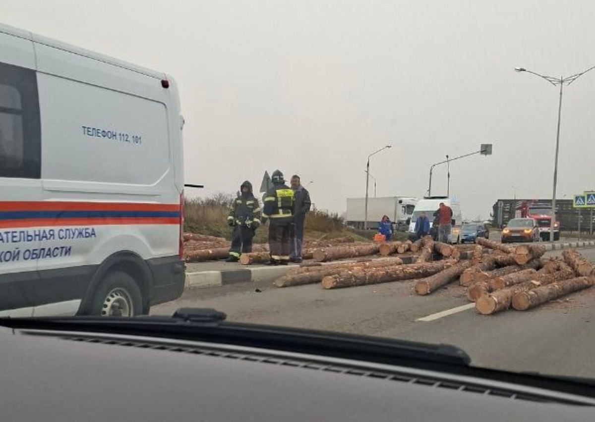 В Белгороде на кольцевой развязке в районе «Виража», произошло опрокидывание фуры, перевозившей лесоматериалы в виде бревен