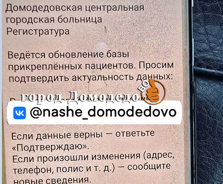 Регистратура Ведётся обновление базы прикреплённых пациентов. Просим подтвердить актуальность данных: (указаны ФИО человека) Если данные верны — ответьте «Подтверждаю». Если произошли изменения (адрес, телефон, полис и т. д.) — сообщите новые сведения. При отсутствии ответа обслуживание по полису ОМС может быть приостановлено. С уважением, Домодедовская центральная городская больница" Напоминаем! Переходить по ссылкам или отвечать на подобные сообщения опасно! Подписывайтесь на новостной канал в Телеграм https://t.me/domodedovolive История Домодедово https://t.me/retrodmd