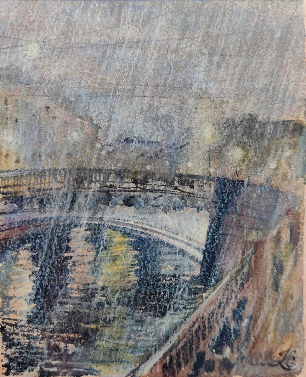 Давно хотела сделать набросок этого моста в вечернем свете. Его боковые части всегда удивительно хорошо освещены и даже немного спорят с мягким светом фонарей почти отвлекая от них. Один из моих любимых уголков Петербурга. Вечернее освещение подчеркнуто неплотной тонировкой листа красной охрой, начинающийся дождь обозначен сухой пастелью. 2025 "Большой Конюшенный мост" Baohong, 300 г/м², охра для тонирования бумаги, акварель Rembrandt гранулирующие, сухая пастель изображение 11 × 13,5 см, лист 13 × 15,5 см.