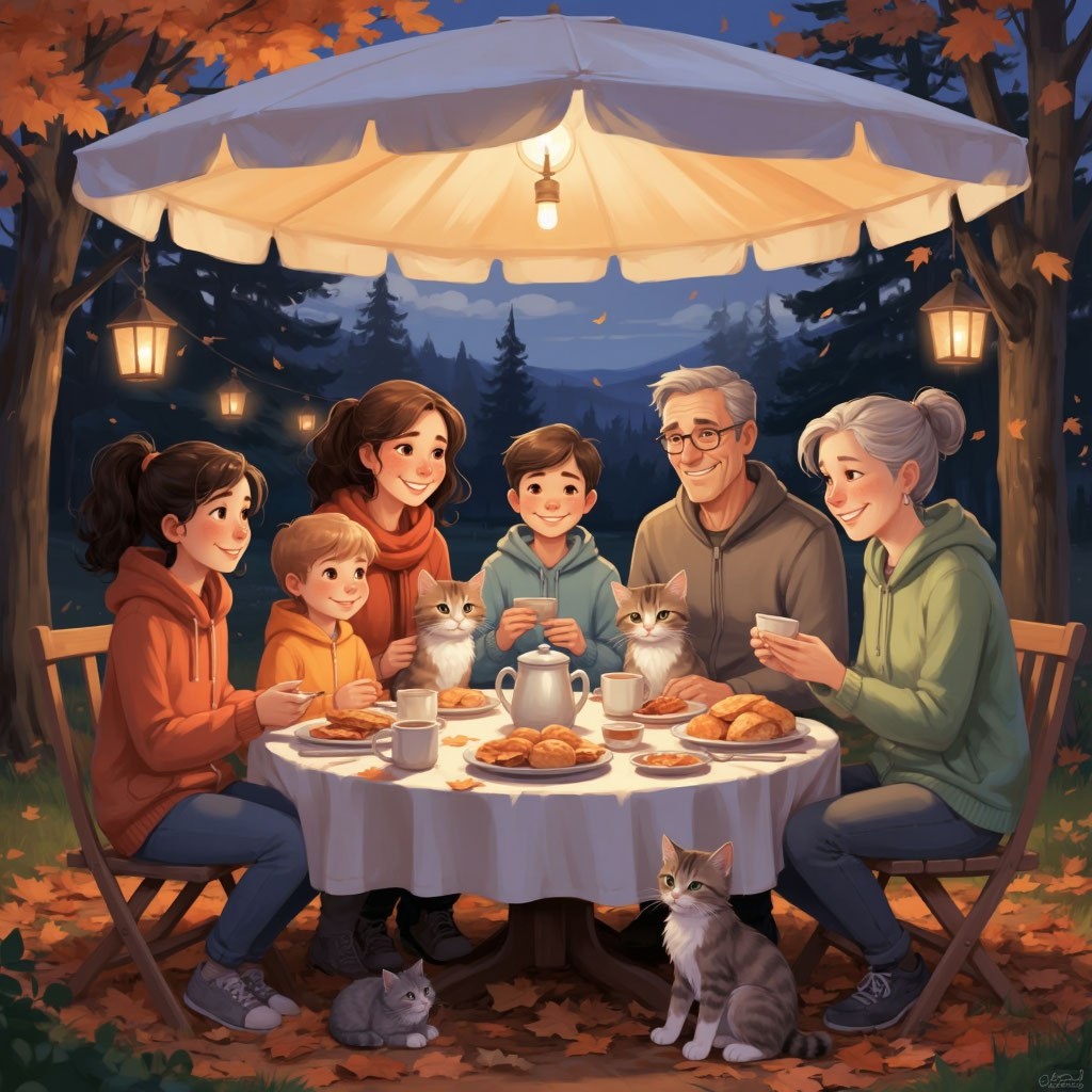 🍁 Осенним вечером компания друзей ужинала под навесом. Воздух был тёплым, лишь слегка отдавая осенней сыростью. Рядом мурлыкали кошки 🐈 — Аришка, Багира, Соня, Муся и Карамелька.