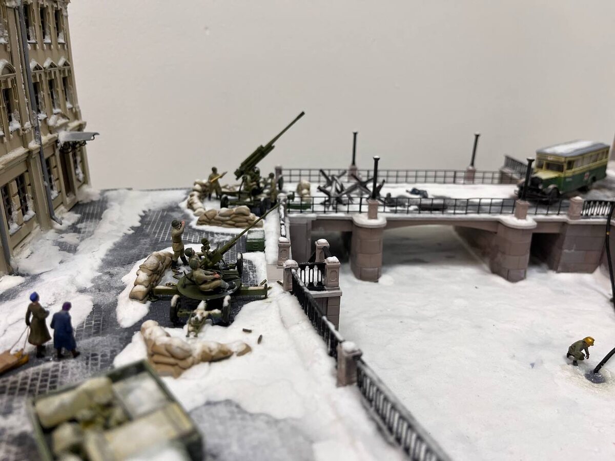 Вторая диорама посвящена блокаде Ленинграда, периоду немецкой оккупации и изоляции города, длившийся с 8 сентября 1941 года по 27 января 1944 года, когда город подвергался массированным артобстрелам и бомбардировкам. Несмотря на жестокие условия, голод и болезни, ленинградцы проявили мужество, и блокада была полностью снята 27 января 1944 года после 872 дней осады. Показан собирательный образ Ленинграда с использованием реально существующих зданий, находящихся на набережной канала Грибоедова: доходный дом Ратькова-Рожнова и здание Екатерининского общественного собрания, а также Банковский мост. Послед очередного немецкого артобстрела горит одно из зданий. Пожар тушит бригада, приехавшая на пожарной машине ПМЗ-2, созданной на базе грузовика ЗИС-5. Вода подается непосредственно из канала. Рядом санитарный грузовик ЗИС-8. На стене здания афиша концерта – Ленинградской 7-й симфонии Шостаковича, - была исполнена в Ленинграде 9 августа 1942 года. Далее видим колонну из танком КВ -1 – это час