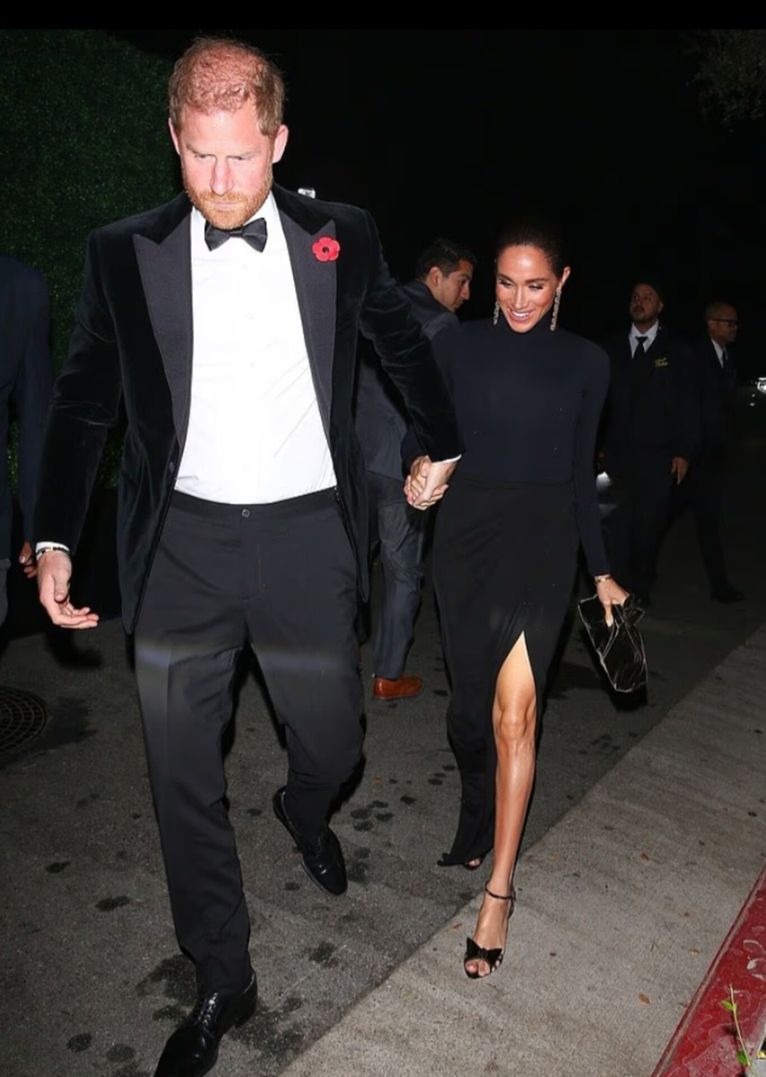 Вчера пресса запечатлела Меган Маркл и принца Гарри, посетивших празднование 70-летия Крис Дженнер. Вечеринка в стиле "Агента 007" проходила в поместье Джеффа Безоса в Беверли-Хиллз. Сассекские были в числе 300 гостей, пришедших выразить свое почтение матери всея Кардашьян. На торжестве не было телекамер, а гостей предупредили, что праздник будет полностью конфиденциальным. Меган и Гарри прибыли со своей охраной и вошли в помещение, держась за руки. В преддверии Дня памяти монтеситский выбрал черный смокинг с галстуком-бабочкой и красным маком, приколотым к лацкану. Меган подобрала вечерний чёрный образ, состоящий из облегающего топа и юбки с запАхом. Герцогиня изобразила на лице смущенную улыбку, идя вслед за мужем под вспышками камер. Британская пресса отметила, что данный выход Сассекских стал одним из самых ярких светских выходов за последние месяцы, что "свидетельствует о том, что они по-прежнему поддерживают связи в кругах видных американских знаменитостей". Именинни