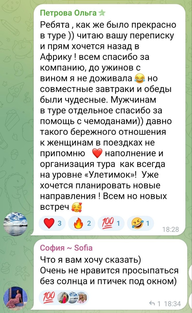 Всем привет! Это Ира:) я сейчас перечитывала отзывы нашей африканской группы. А там столько слов(приятных!), что не влезают в скрины. И я подумала, что ведь наша работа, не смотря на нервотрёпку, вечные цейтноты, чужие изменения планов, и нереальную ответственность, которую все массажисты сразу чувствуют на моих плечах...очень любимая! Ведь в работе что важно? Сразу ощущать результат. И уж с этим у нас проблем нет. Спасибо, что не держите эмоции в себе - и выдаете нам в больших количествах. А ещё и у нас, и у вас появляется множество друзей по всех стране. Что согласитесь, очень круто, особенно, в 40+ Путешествия, впечатления и свои люди. Это ли не счастье?❤️ #улетим_отзывы #юар_улетим #юар