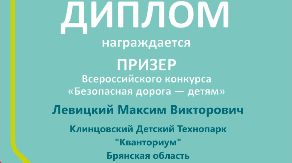 С 2 по 30 сентября 2025 года проходил ежегодный конкурс «Безопасная дорога – детям», собравший более 4600 участников со всей России. Организатором выступило Министерство просвещения РФ при поддержке Всероссийского центра развития художественного творчества и гуманитарных технологий. Воспитанник IT-квантума клинцовского детского технопарка «Кванториум» Максим Левицкий под руководством наставника Валерия Марченко занял третье место в номинации «Медиа». Его интерактивный сайт о правилах дорожного движения стал ярким примером того, как современные технологии помогают формировать культуру безопасного поведения. Сайт Максима представляет собой удобный и информативный ресурс, на котором можно изучить правила дорожного движения и пройти тесты для проверки знаний. Победа юного кванторианца — не только личное достижение, но и результат работы всего детского технопарка «Кванториум», где созданы условия для развития талантов, поддержки наставников и освоения передовых технологий. Проект Максима Ле
