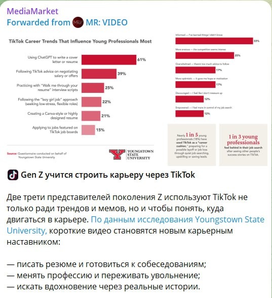 Штабные старпёры российского радиовещания, облачённые во всё гражданское-заграничное, может, и посмеются с этой новости, называя миллионы людей, живущих в развитых странах дебилами, только дебилы по факту они сами, ведь мозга у них не хватает понять, почему массовая аудитория младше 40 не слушает и уже никогда не будет слушать радио. Две трети представителей поколения Z используют TikTok не только ради трендов и мемов, но и чтобы понять, куда двигаться в карьере. По данным исследования Youngstown State University, короткие видео становятся новым карьерным наставником: — писать резюме и готовиться к собеседованиям; — менять профессию и переживать увольнение; — искать вдохновение через реальные истории. Более 10% опрошенных признались, что конкретный ролик помог им получить работу. Однако соцсеть не вытеснила LinkedIn — он по-прежнему остается основным инструментом для поиска вакансий. А вот российские радиостанции что дают молодой аудитории? Палкой деланных героев, не умеющих петь,